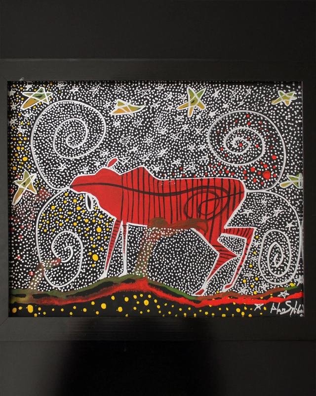“I see making art as a way of organizing chaos. Sometimes within the chaos of making a painting, a symbol in the shape of a moose or a caribou will walk through my consciousness, in a form that resembles an ancient petroglyph. My work is inspired by the ancient petroglyphs that were carved in stone by my ancestors on walls in caves, as a way to capture and respect the spirit of the subject. When I paint these images, I feel I am channeling a way to bring their spirits back into our consciousness.” – Alan