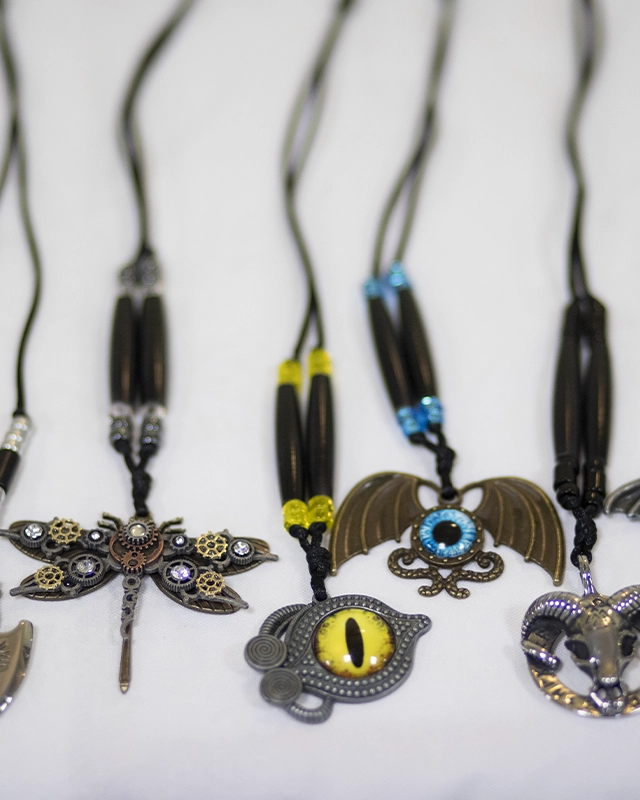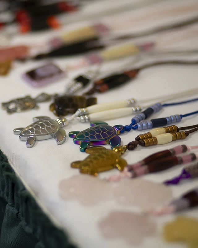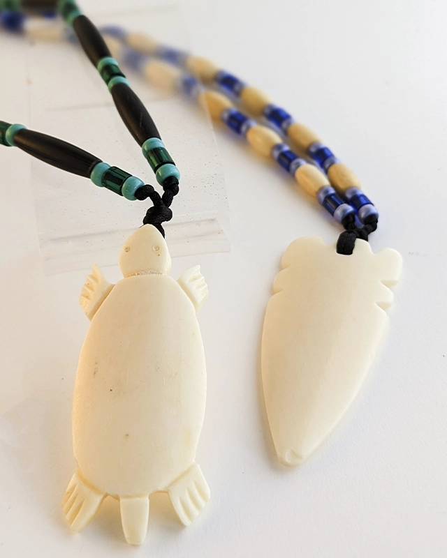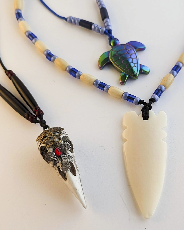 Bear Man Authentics primarily produces leather-cord necklaces featuring pendants of fused glass, bone, and traditional symbols like Inukshuks and turtles. Clifford’s designs are distinguished by their craftsmanship and adjustable features. His products are sold at powwows, mawiomis, craft shows, and conferences, where he builds relationships with customers through shared stories and cultural exchanges.