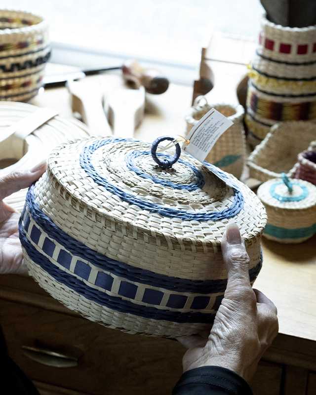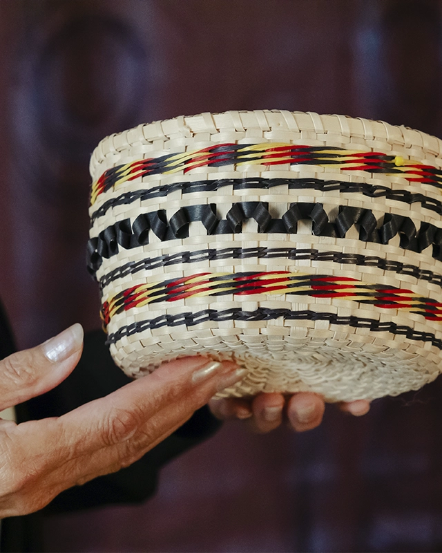 Della’s basketry reflects a profound connection to her heritage, using traditionally harvested materials such as black ash (wisqoq) and sweetgrass and incorporating designs that come from her family roots. Her one-of-a-kind work not only showcases artistic excellence but also serves as a medium for cultural education and storytelling. Della feels this work honours her many generations of ancestors who excelled in basketmaking.